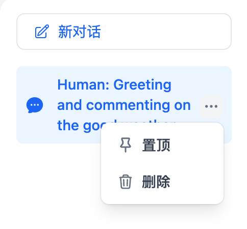 点击 “新对话” 按钮开始一个新的对话。移动到一个会话上，可以对会话进行 “置顶” 和 “删除” 操作。