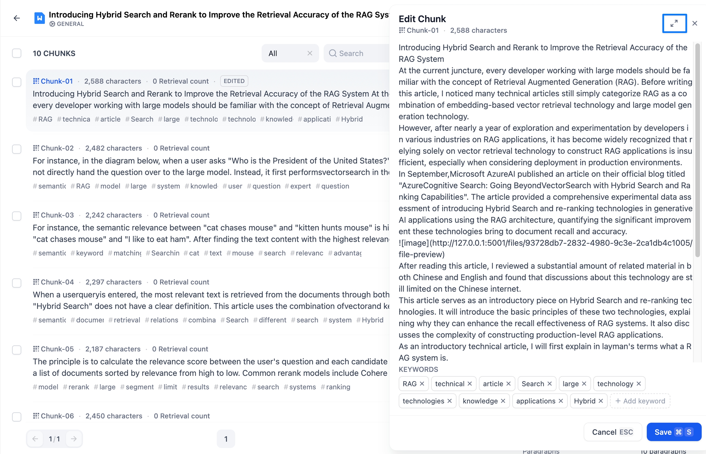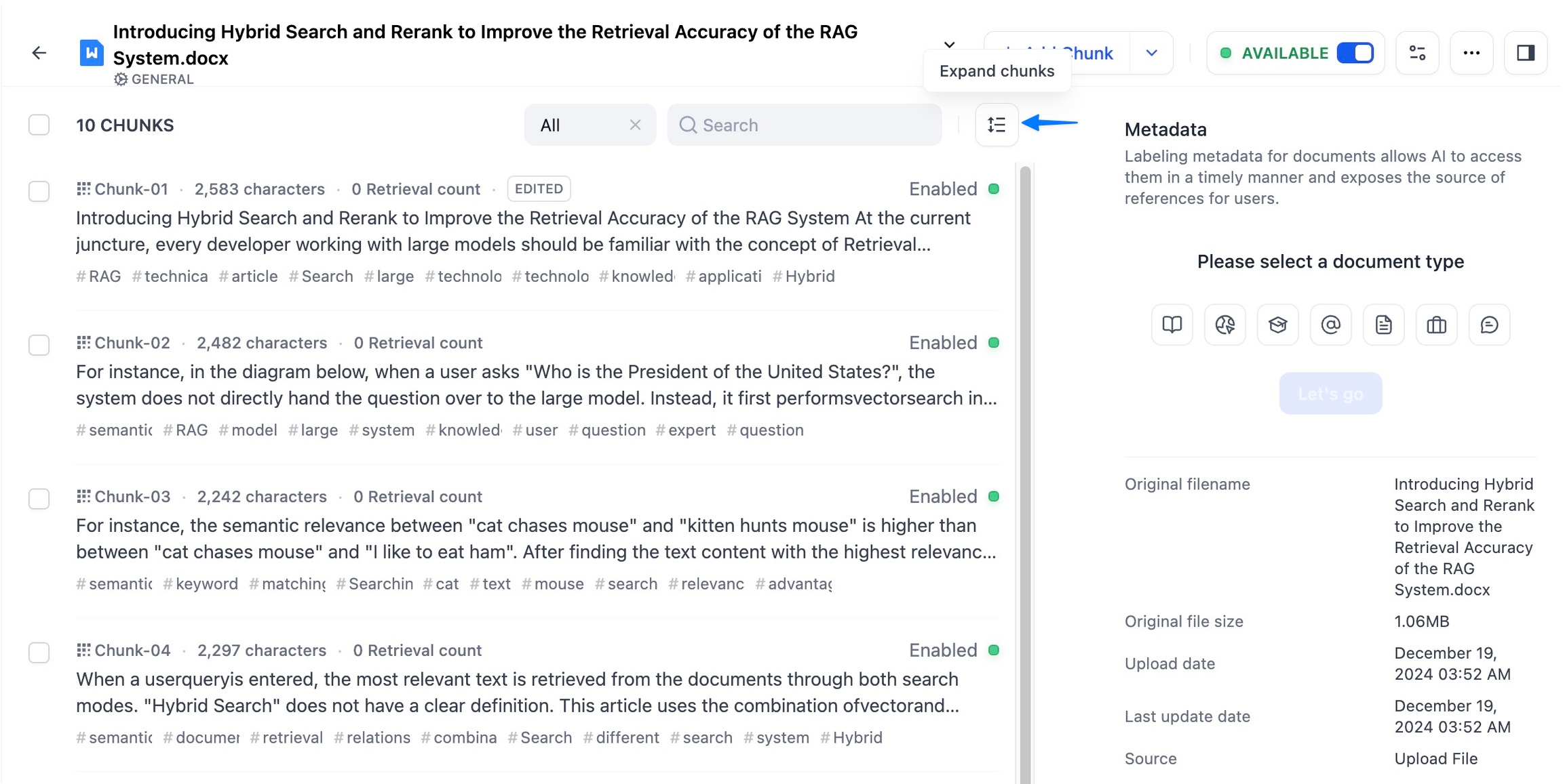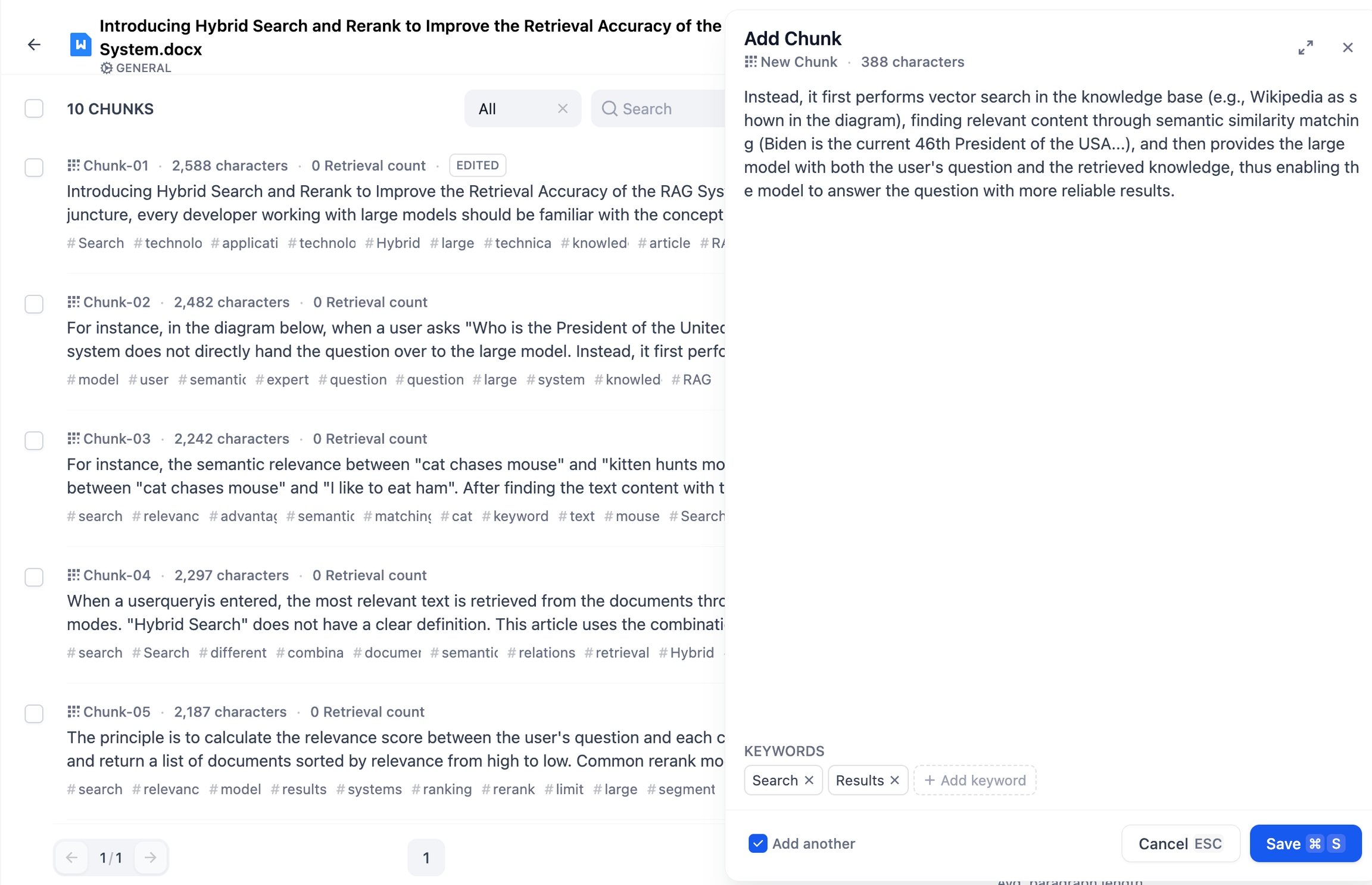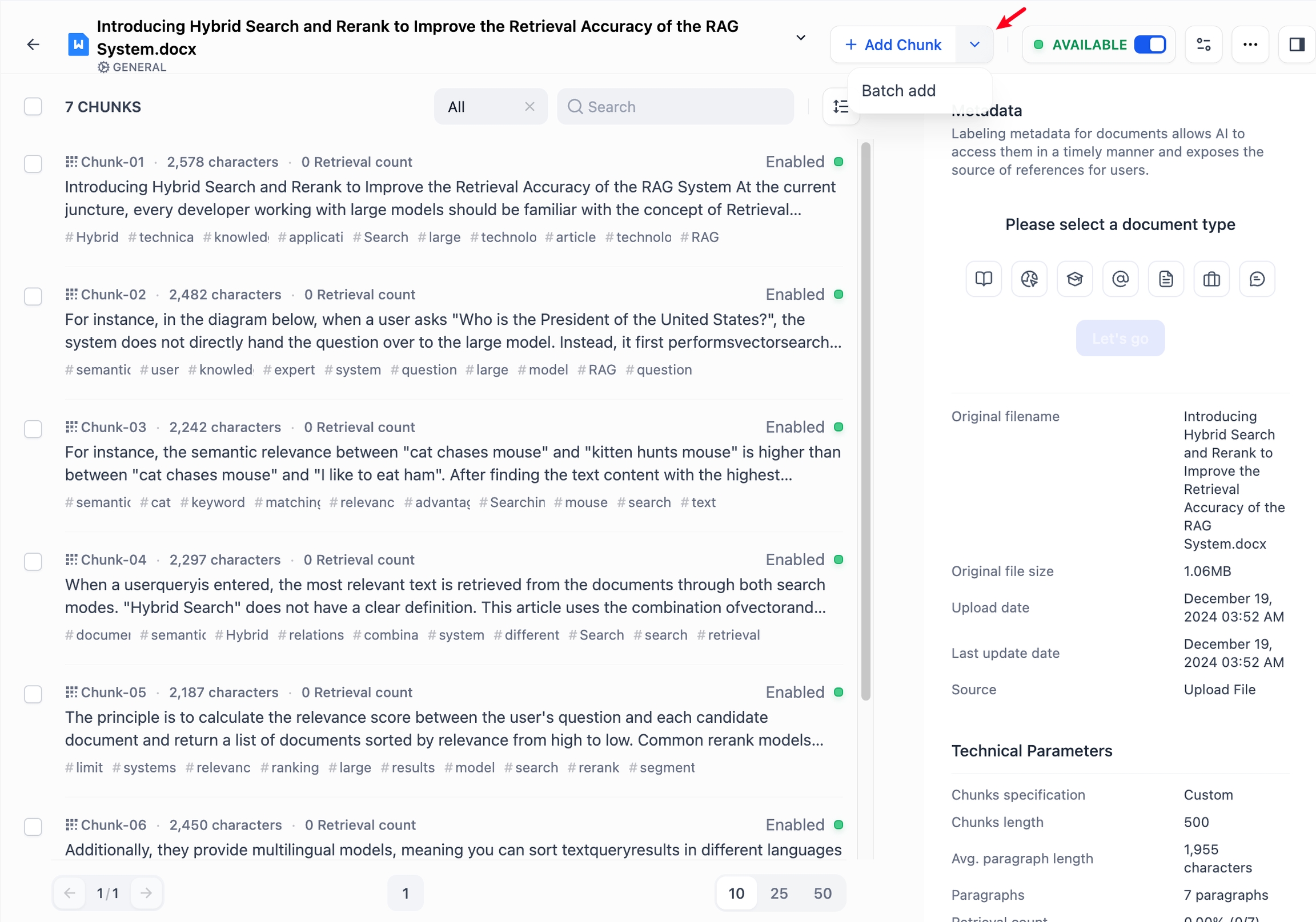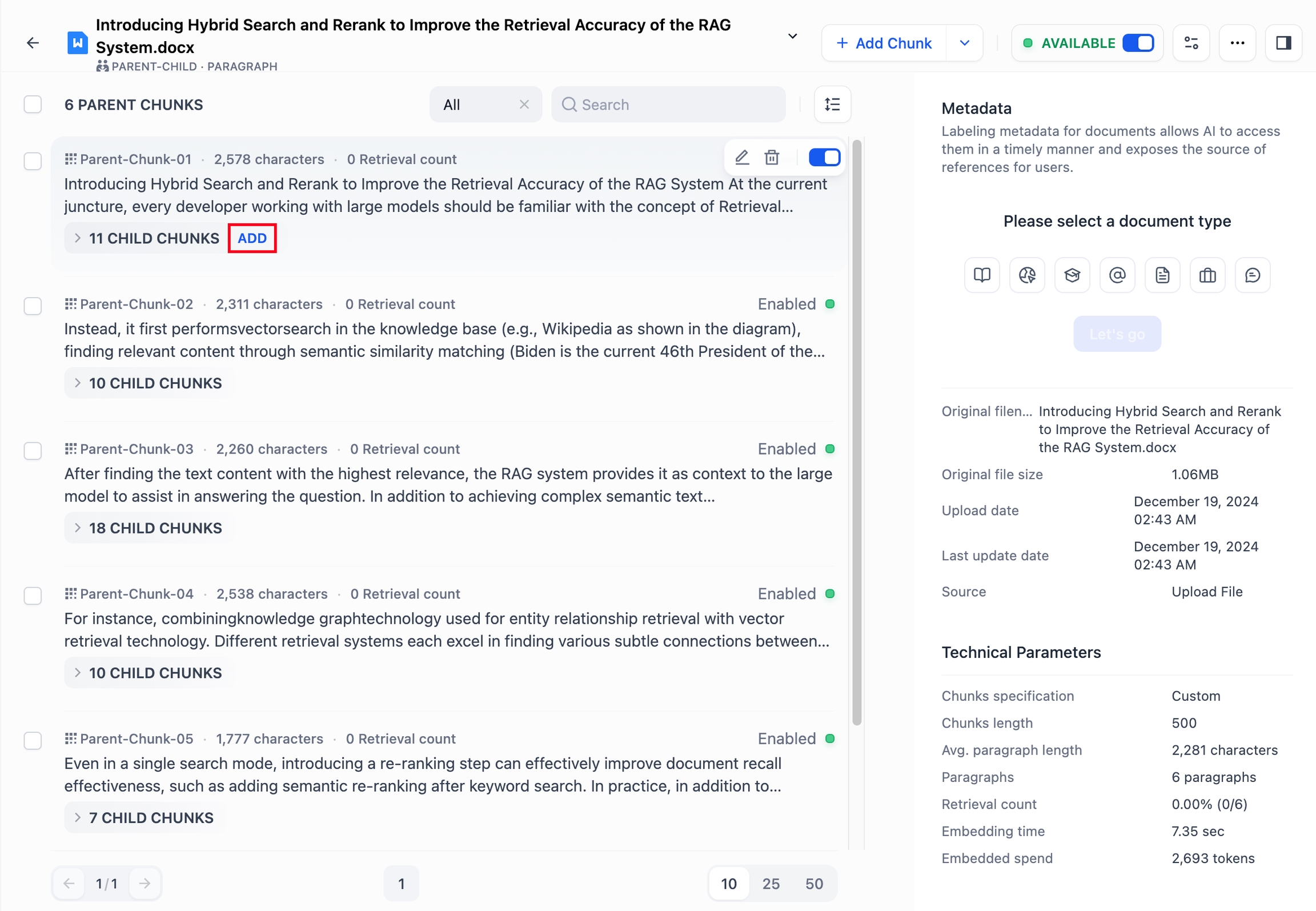 知识库内已上传的每个文档都会以文本分段(Chunks)形式进行存储。点击文档标题,在详情页中查看当前文档的分段列表,每页默认展示 10 个区块,你可以在网页底部调整每页的展示数量。