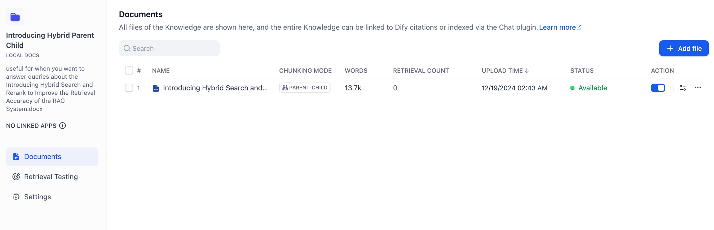 点击“知识库” → “文档列表” → “添加文件”,在已创建的知识库内上传新的文档。