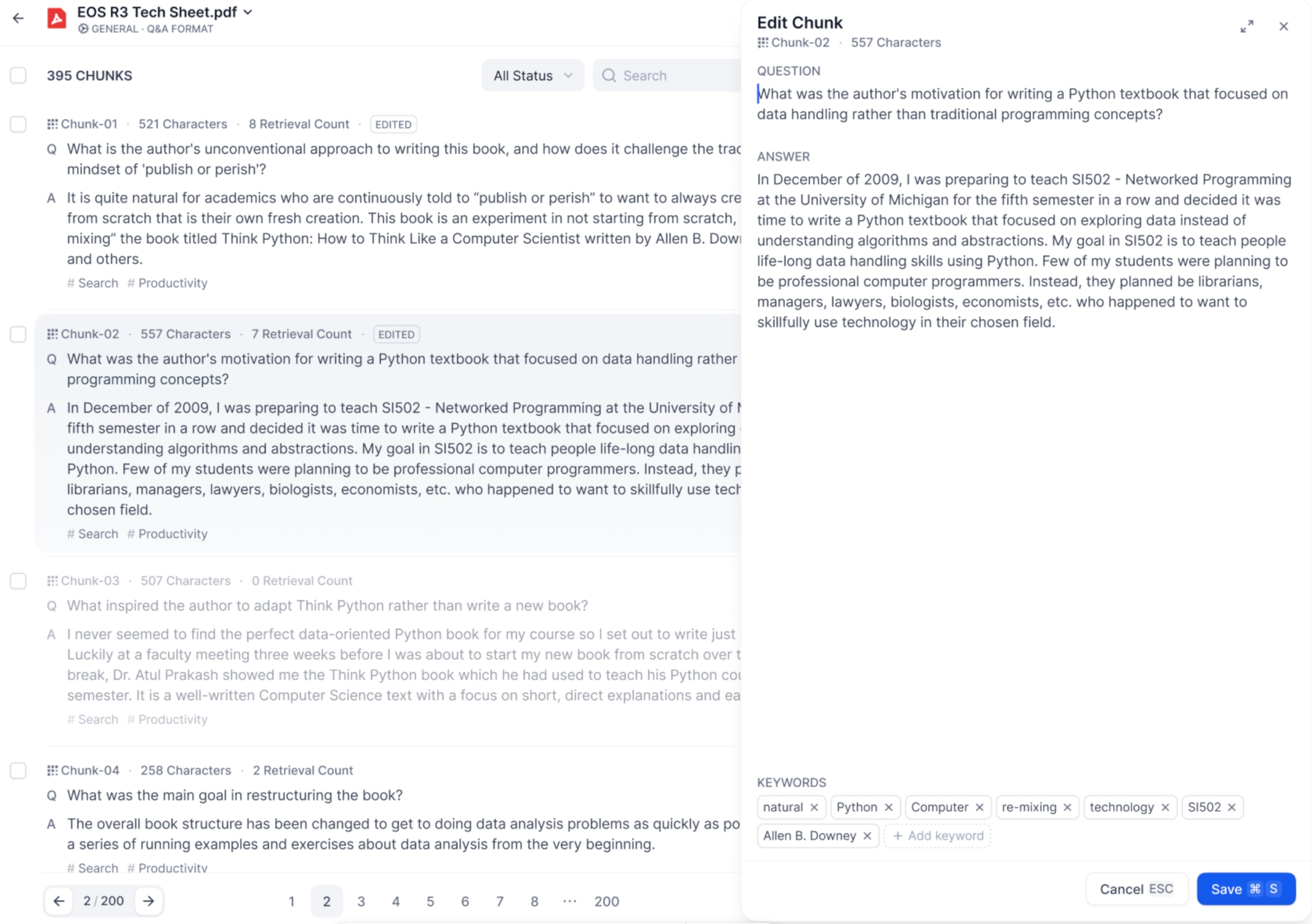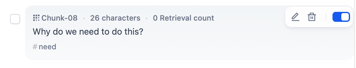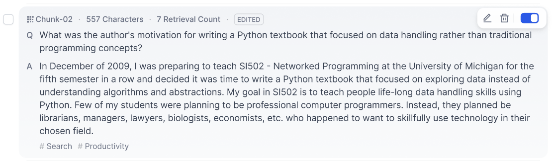在 Q&A 分段模式下,一个内容区块包含问题与答案。点击需要编辑的文本分段,可以分别对问题和答案内容做出修改;同时也支持修改当前区块的关键词。