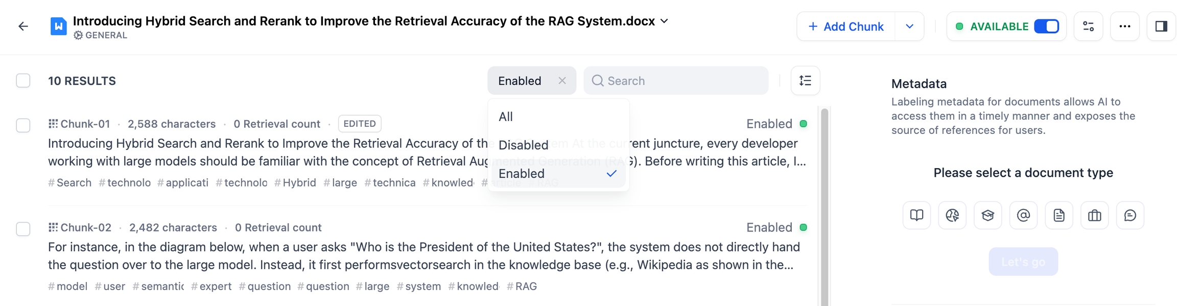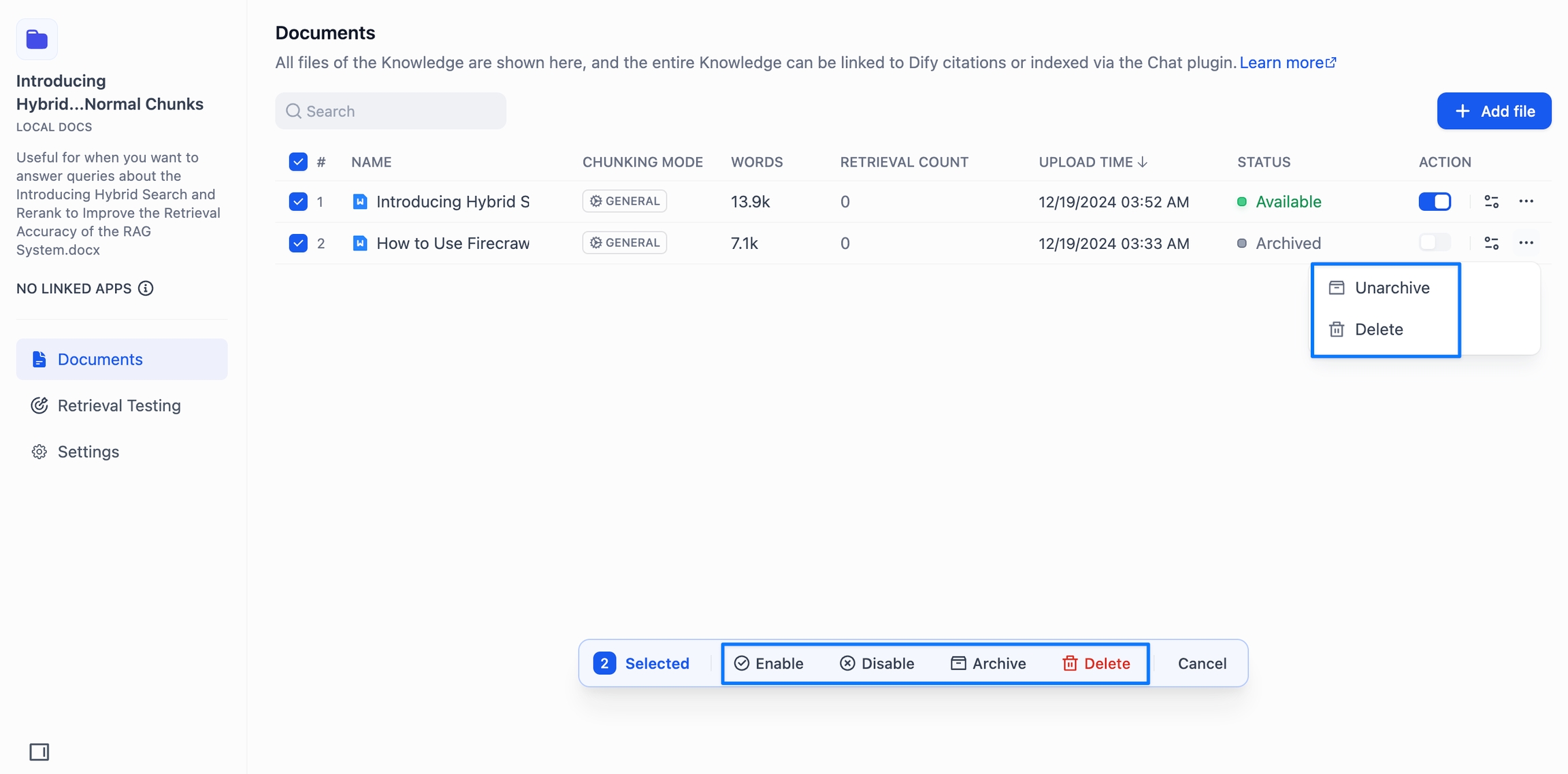 启用:处于正常使用状态的文档,支持编辑内容与被知识库检索。对于已被禁用的文档,允许重新启用。已归档的文档需撤销归档状态后才能重新启用。