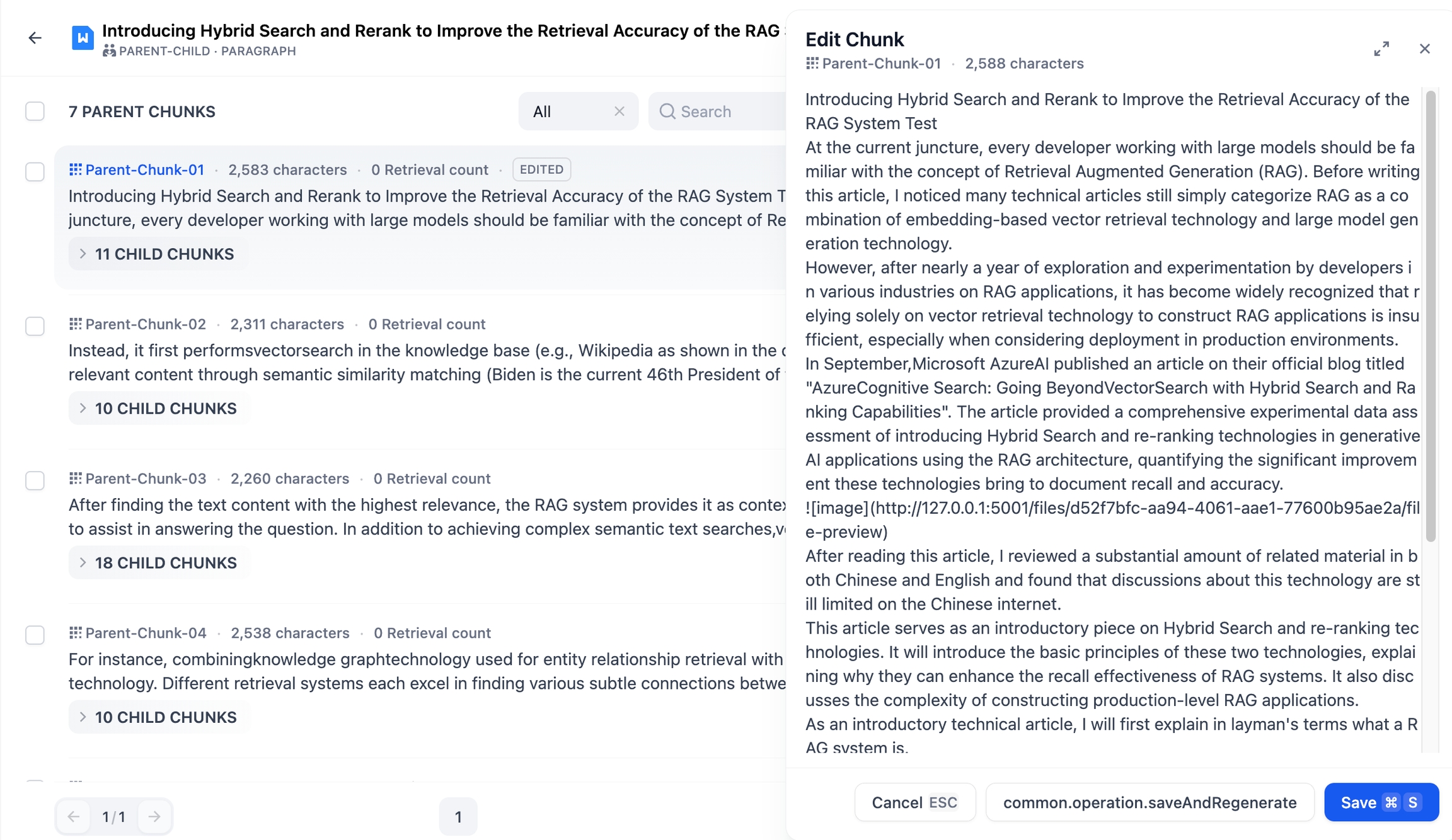 修改父分段:轻点父分段右侧的编辑按钮,填写内容。点击 “保存” 后将不会影响子分段的内容。如需重新生成子分段内容,轻点 “保存并重新生成子分段”。