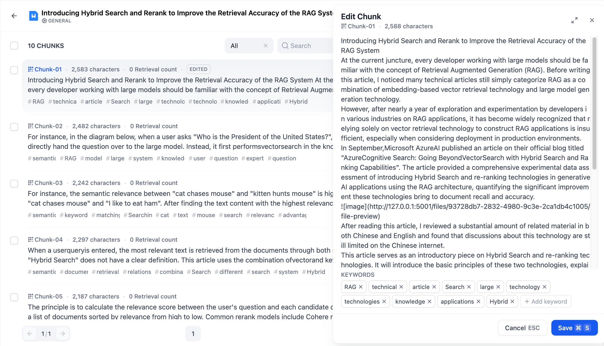 通过字符长度、标识符或者 NLP 语义分段等机器自动化的分段方式虽然能够显著减少大规模文本分段的工作量,但分段质量与不同文档格式的文本结构、前后文的语义联系都有关系,通过人工检查和订正可以有效弥补机器分段在语义识别方面的缺点。