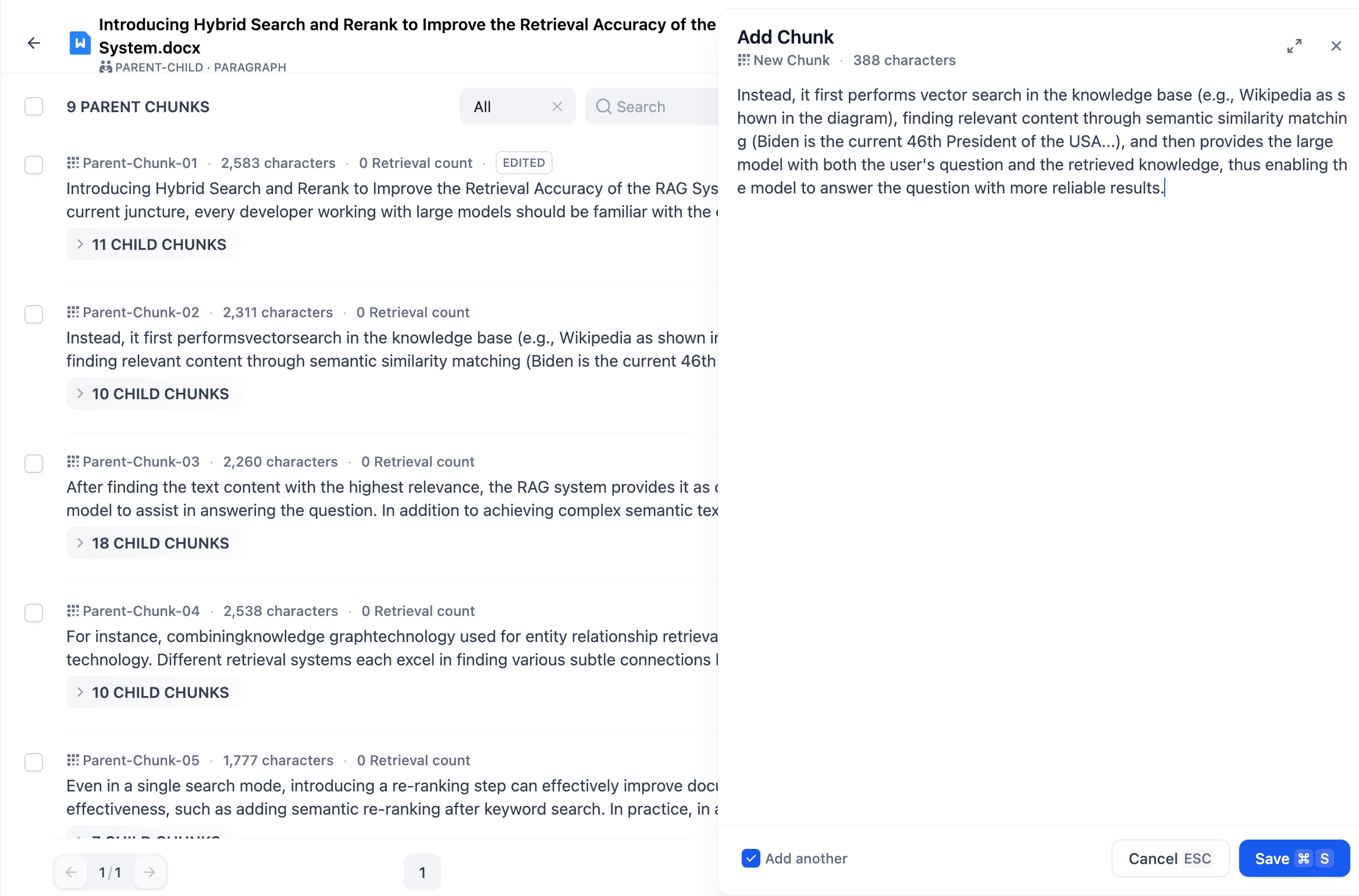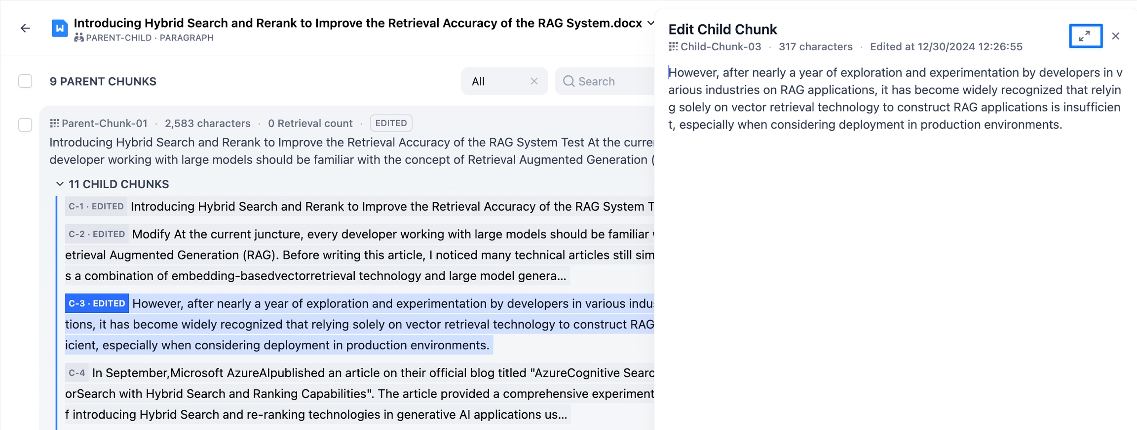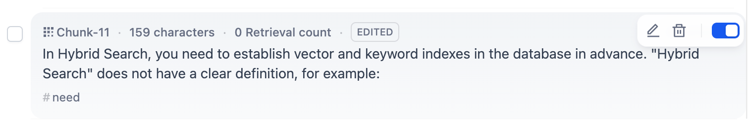 修改子分段: 选择任意子分段后进入编辑模式,修改完成后即可保存。修改后不会影响父分段中的内容。被编辑过或新增的子分段区块会被打上 C-NUMBER-EDITED的深蓝色标签。