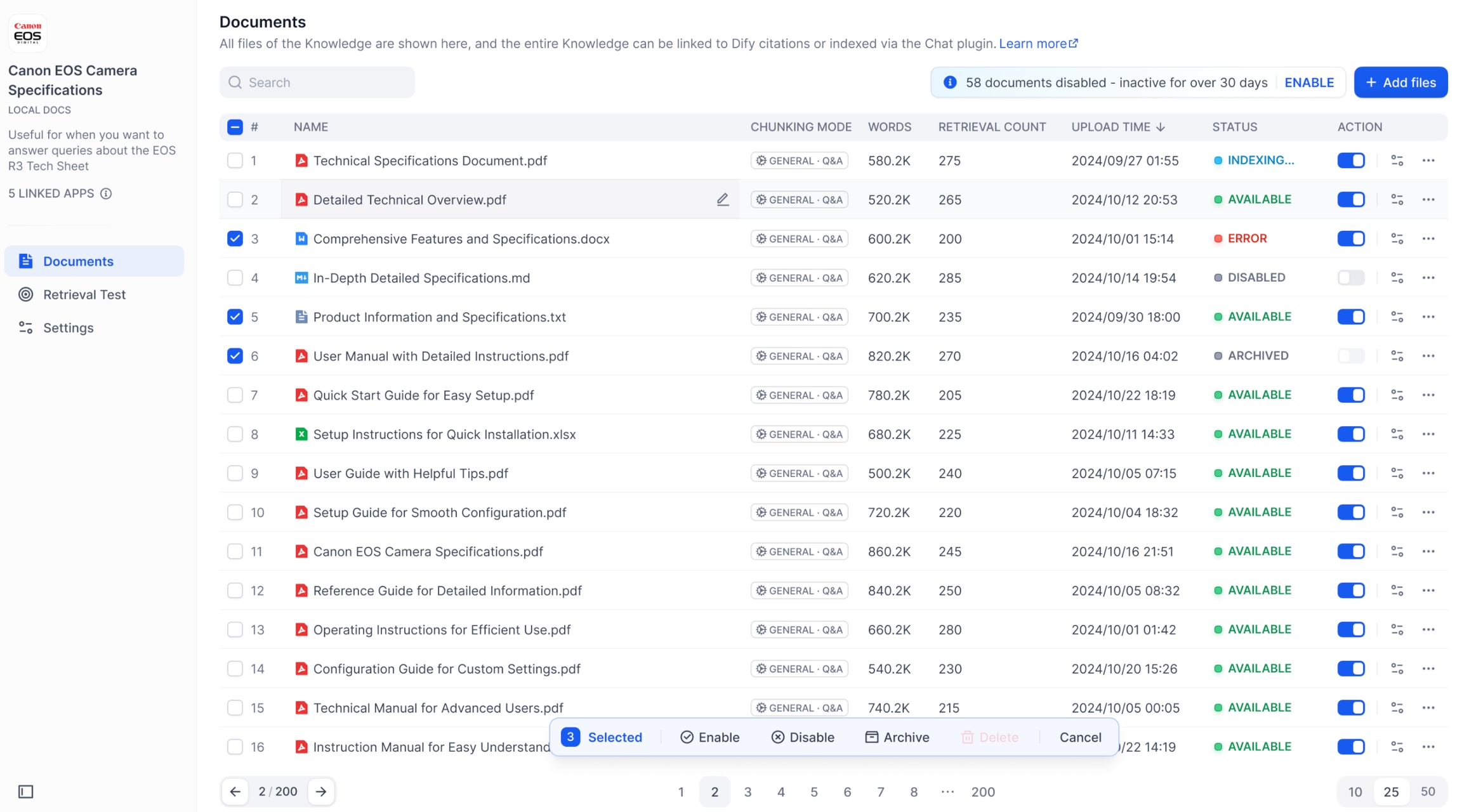 如果你的知识库中有部分文档长时间未更新或未检索时,为了确保知识库的高效运行,系统会暂时禁用这部分不活跃的文档。