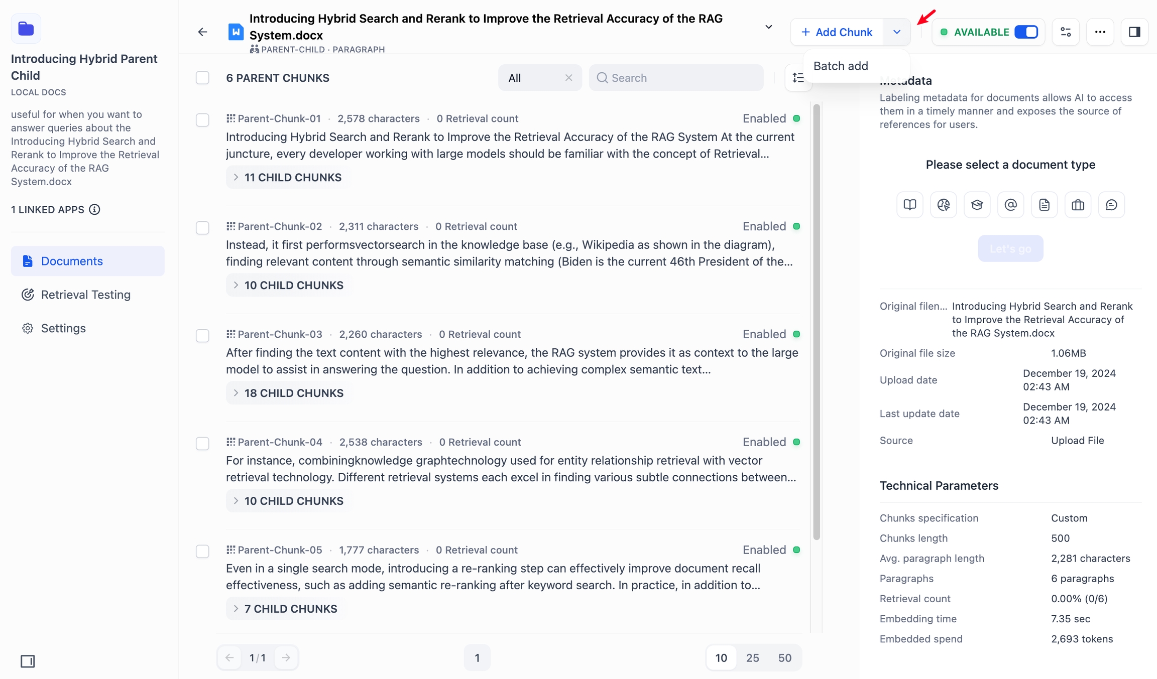 子分段一般为段落中的某个句子(较小的文本块),包含细节信息。各个分块均会展示字符数以及被检索召回的次数。轻点“子分段”即可查看更多详细内容。若希望查看区块内的完整内容,轻点区块右上角的全屏 icon 进入全屏阅读模式。