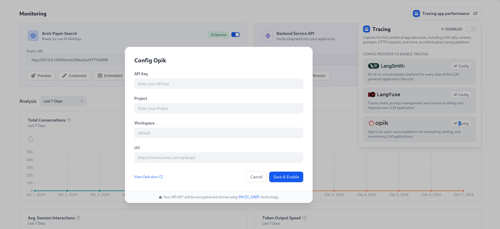 点击配置后,将在 Opik 中创建的 API Key 和项目名称粘贴到配置中并保存。