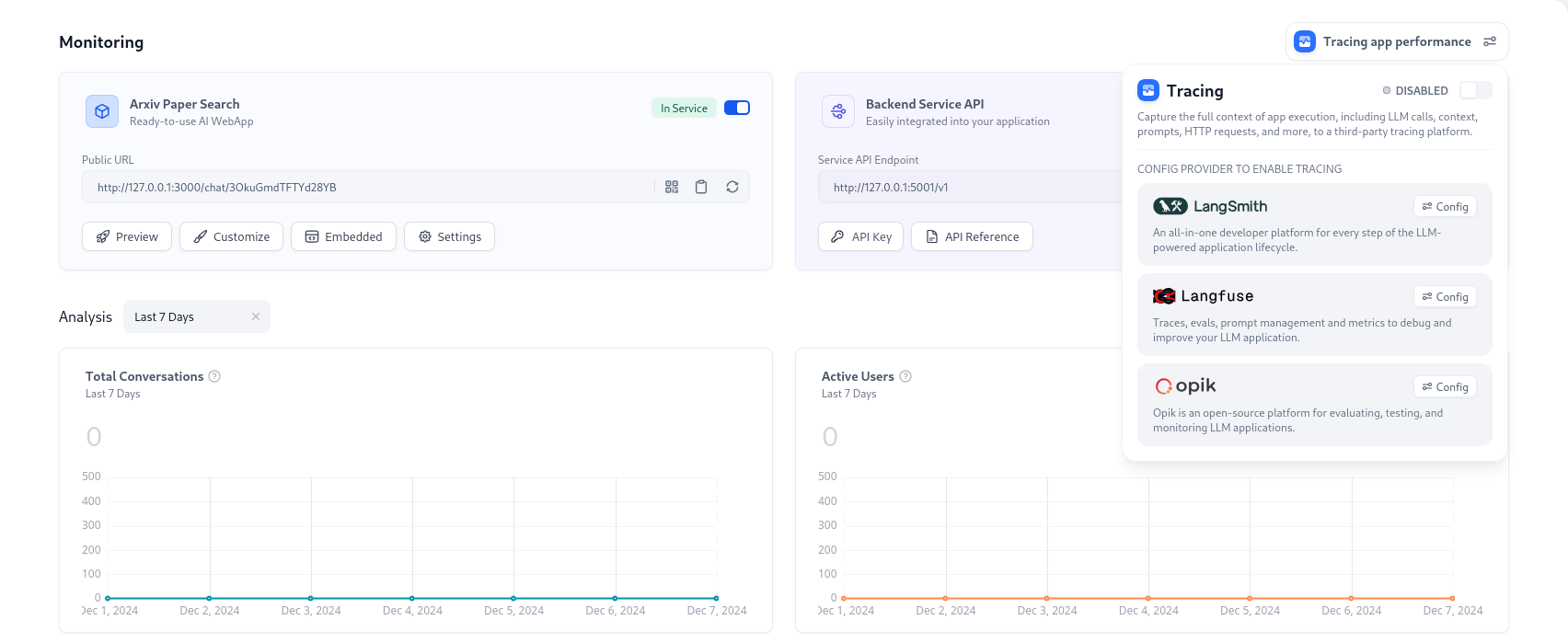 在 Dify 应用程序中配置 Opik。打开需要监控的应用程序,在侧边菜单中打开监控,并在页面上选择追踪应用性能。
