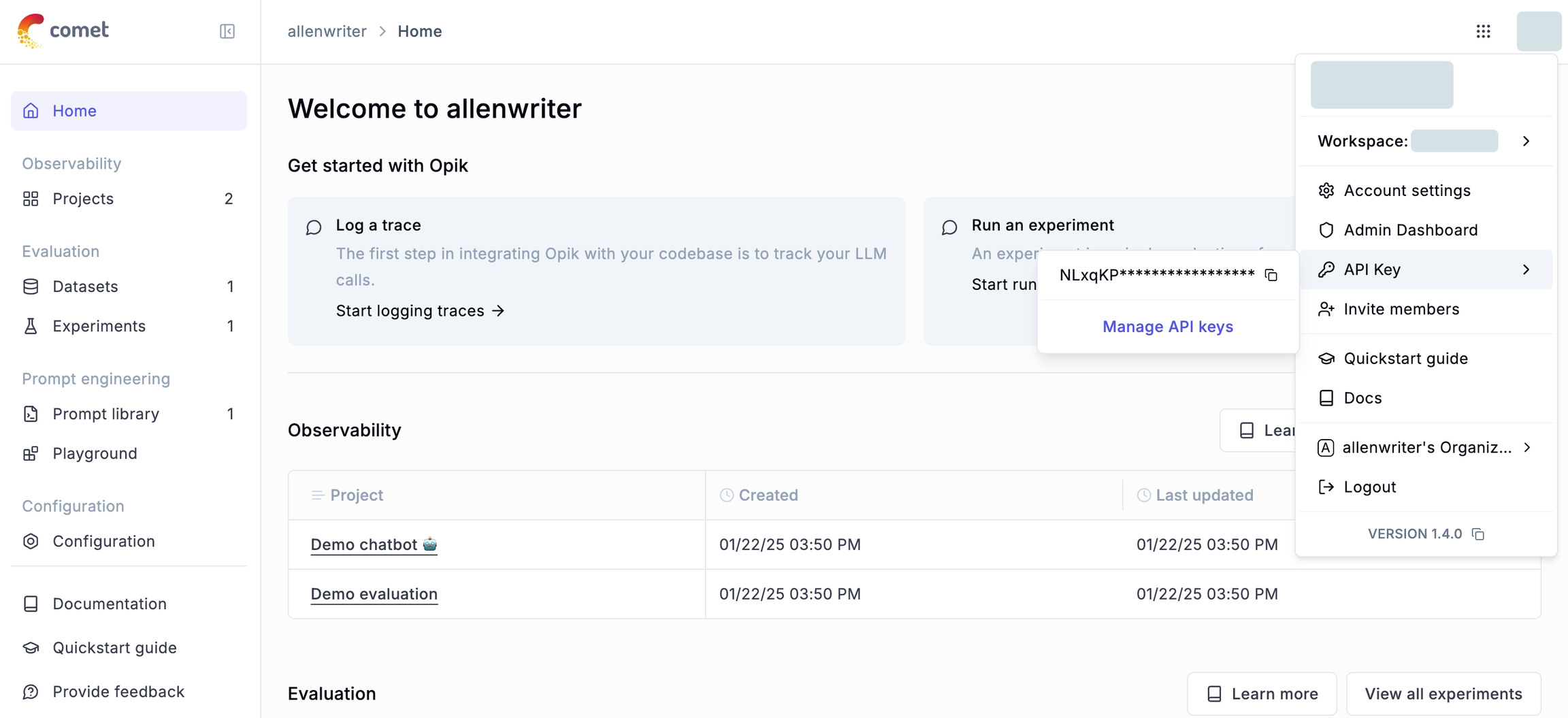 从右上角的用户菜单中获取 Opik API 密钥。点击 API Key,然后点击 API Key 进行复制: