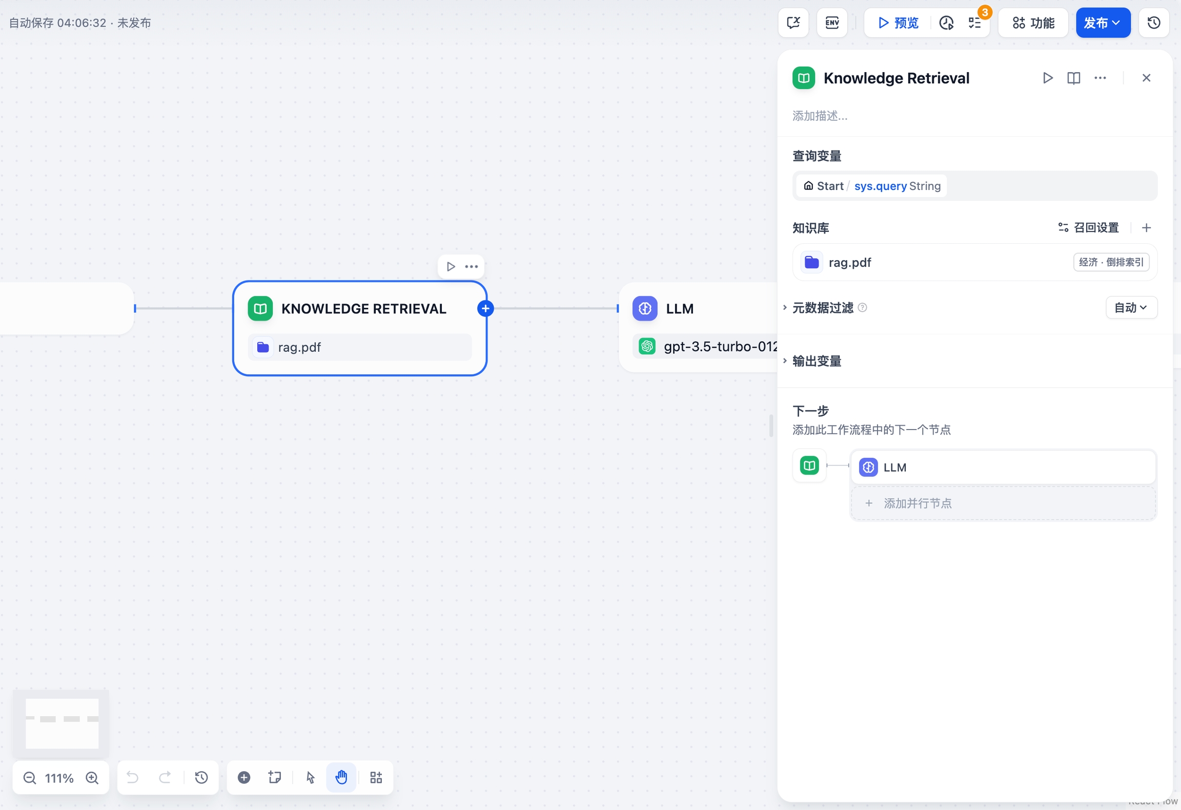 下图为一个最基础的知识库问答应用示例,该流程的执行逻辑为:知识库检索作为 LLM 节点的前置步骤,在用户问题传递至 LLM 节点之前,先在知识检索节点内将匹配用户问题最相关的文本内容并召回,随后在 LLM 节点内将用户问题与检索到的上下文一同作为输入,让 LLM 根据检索内容来回复问题。