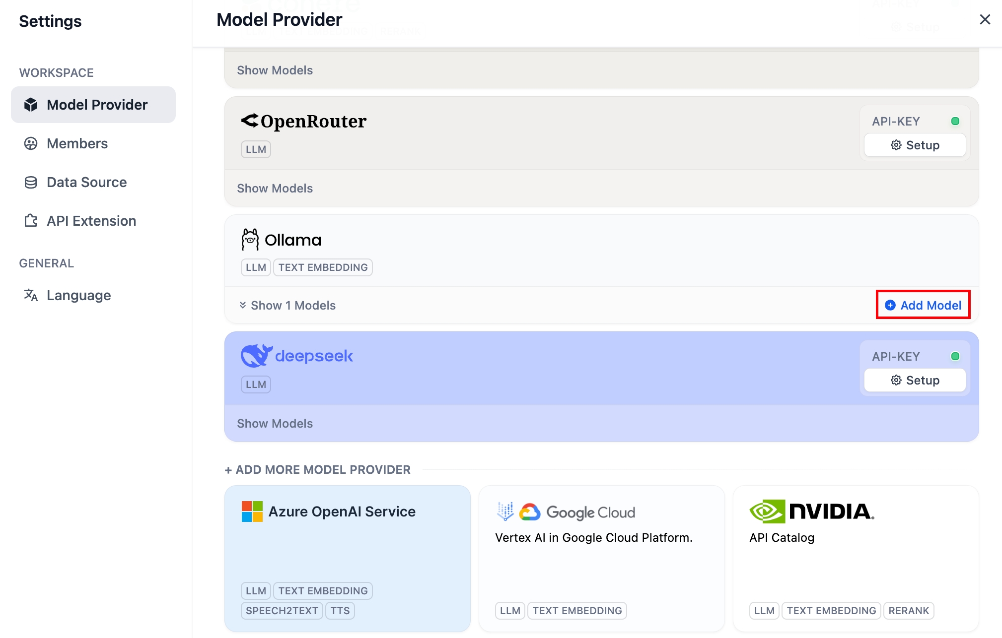 模型供应商内的 DeepSeek 对应在线 API 服务;本地部署的 DeepSeek 模型对应 Ollama 客户端。请确保 DeepSeek 模型已成功部署由 Ollama 客户端部署,详细部署说明请参考上文。