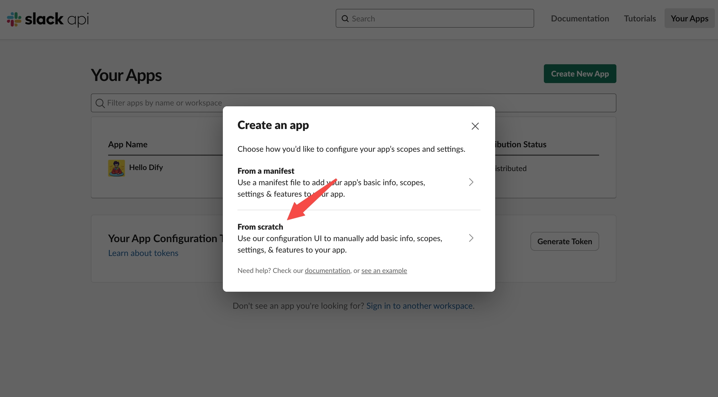 前往 Slack API 平台, 选择以 scratch 方式创建 Slack APP,并选择需部署应用的 Slack 空间。