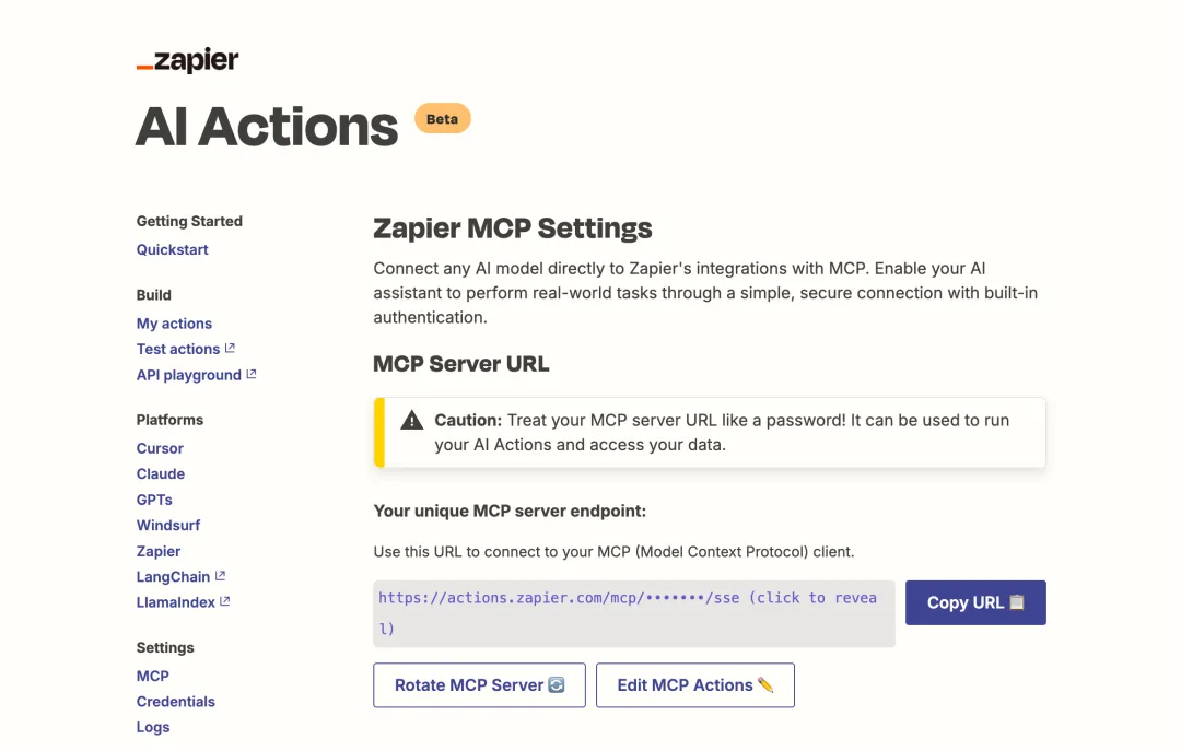 Zapier 的 MCP Server 将其已有的 7000+ 应用和 30,000+ 操作(Action)统一封装到了一个 MCP Server URL 中。你可以在 Zapier 后台,自主选择和配置需要的工具及操作,比如发邮件、在 CRM 中创建记录、在 Slack 中发送通知等。只需将 MCP Server URL 填入 Dify MCP 插件的配置,就能让 LLM 在对话或流程中,自动调用这些工具完成各类任务。