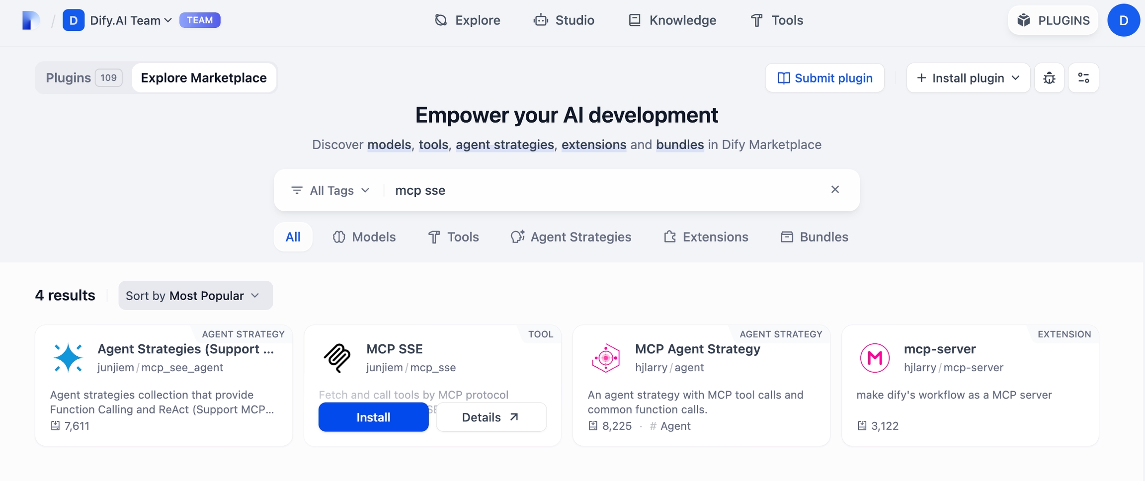 前往 Dify 插件市场,搜索 MCP SSE 插件并点击安装。