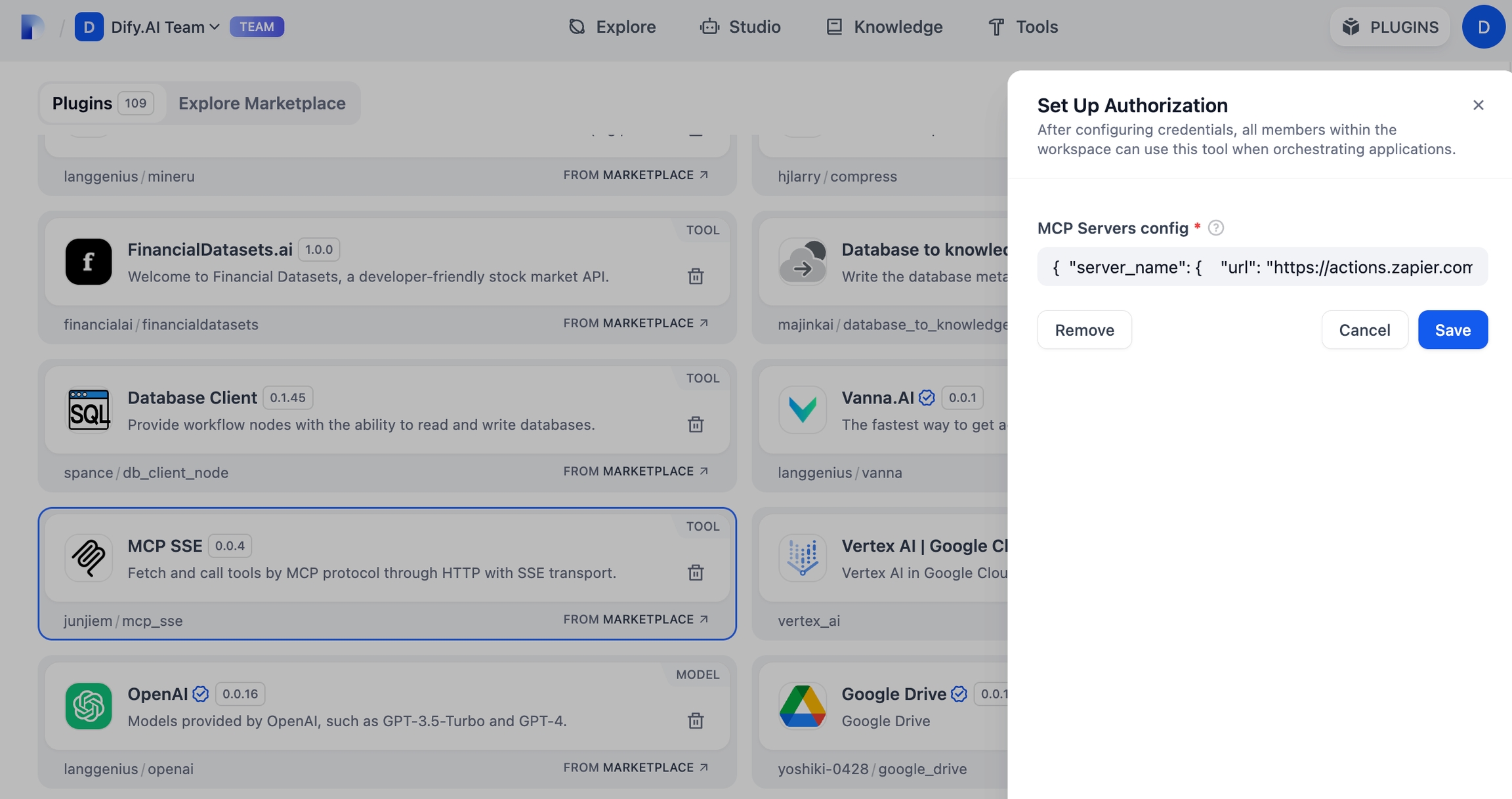 为 Dify 工作空间安装 MCP SSE 插件,远程调用 Zapier MCP 服务以实现自动发送邮件。