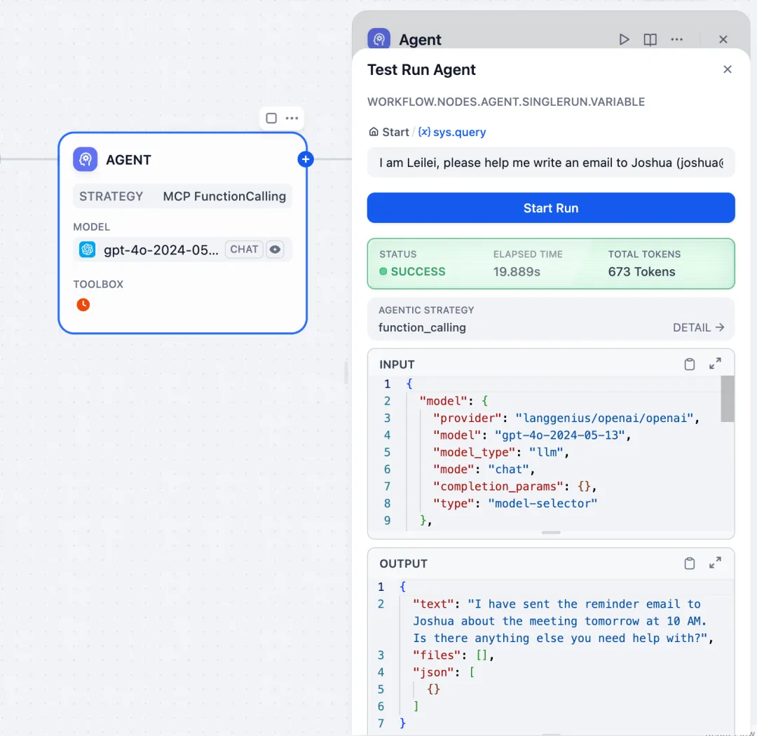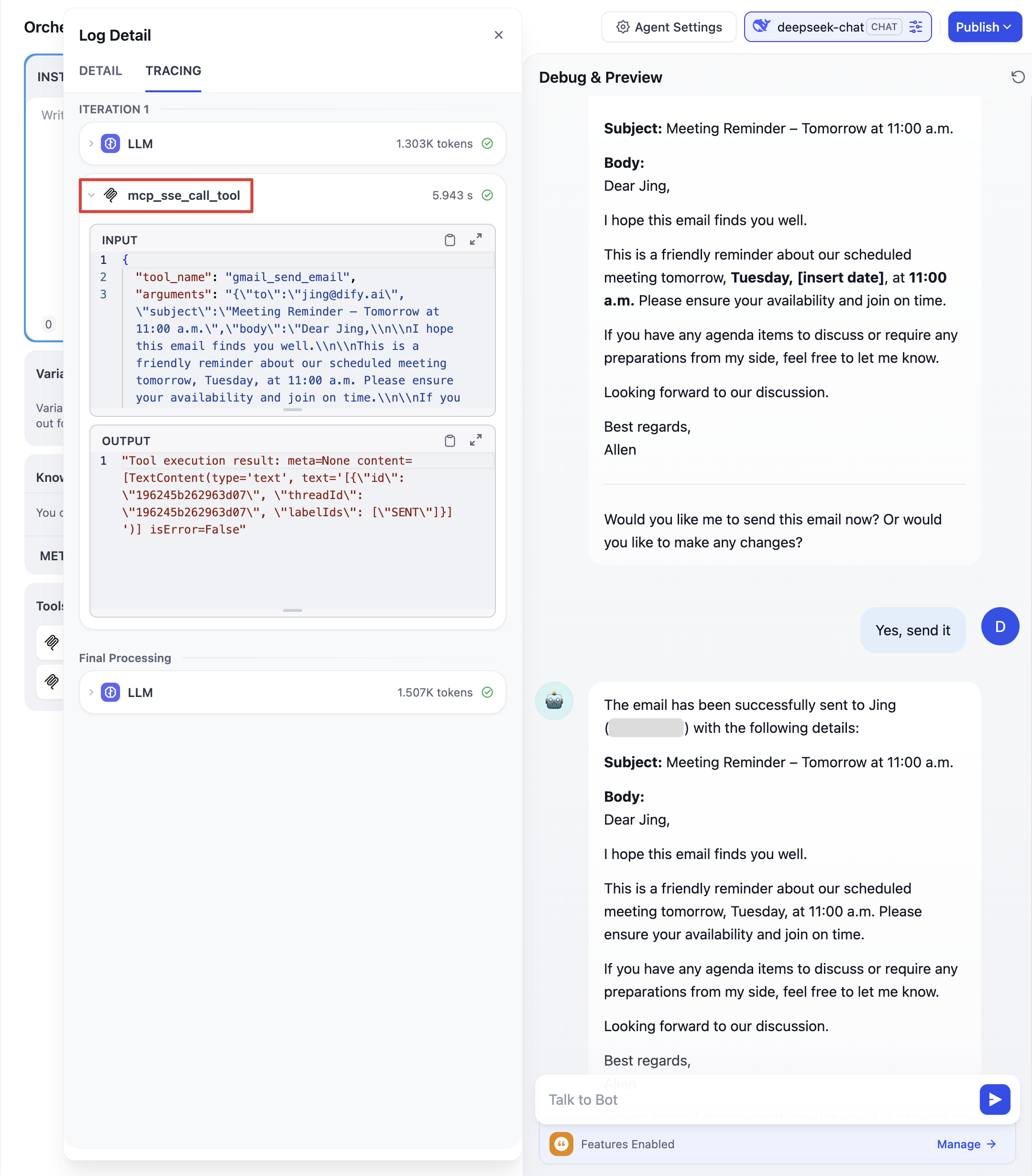 配置完成后,当 Workflow 运行到该 Agent 节点时,就能够根据 Prompt 指令,利用配置好的 Zapier MCP Server 来执行任务。如下图所示,调用 Gmail 发送邮件: