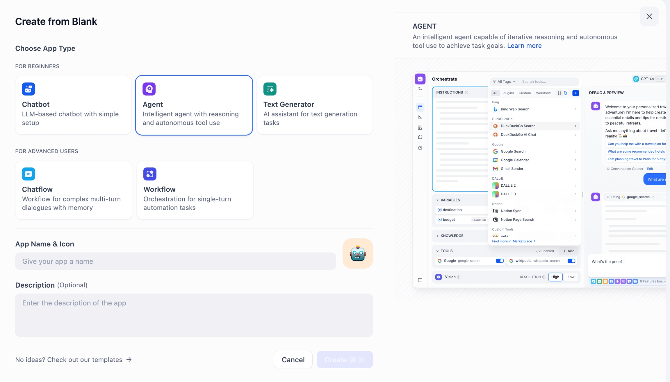 从导航选择 「工作室」,在应用列表内选择 「从空白创建」 并选择 Agent 应用类型,填写应用名称后完成创建。