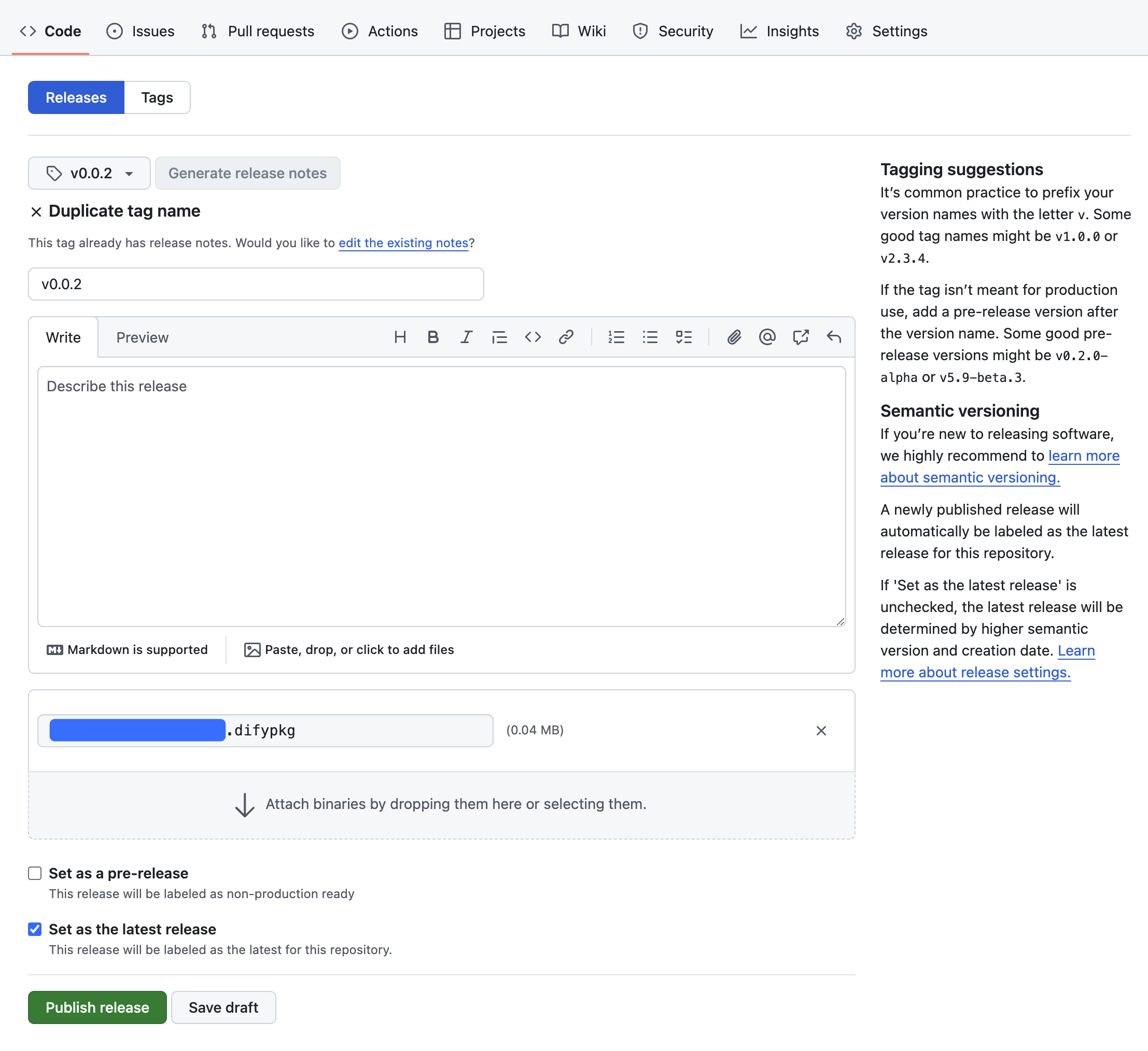 前往 GitHub 代码仓库的 Releases 页,创建一个新的版本发布。发布版本时需上传插件文件。关于如何打包插件文件,详细说明请阅读打包插件。